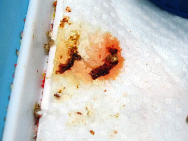少しわかりづらいのですが尿に血が混じっています。この小鳥さんは腎臓障害によって血尿が出ます。