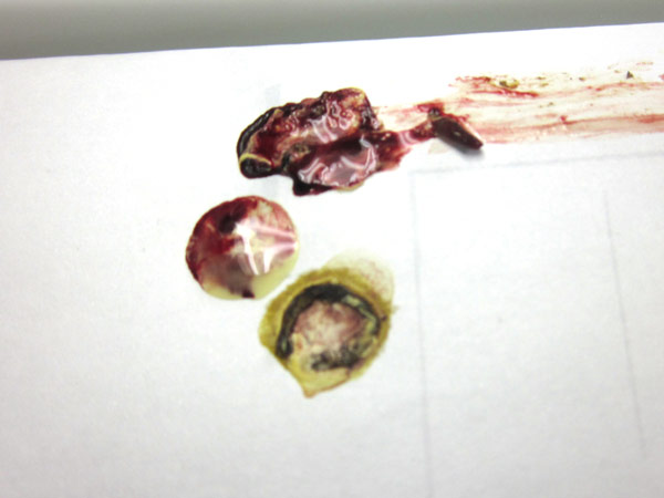 この尿は緑でもあり赤くもあります。重金属中毒・鉛中毒で見られます。非常によくない状態です。すぐに治療を必要としています。
